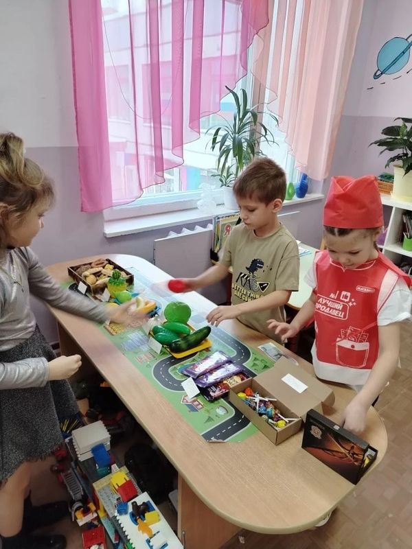 Дети самостоятельно создали среду для игры в супермаркет, в котором попробовали оплачивать товары деньгами и картами. Во время игры сделали вывод, что для большей посещаемости нужна реклама! Именно с этого начнётся наше следующие занятие!